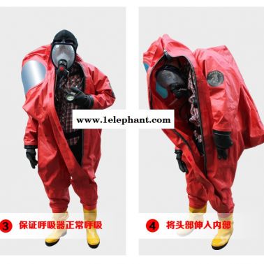 1.服装为连体式全封闭结构,外置背囊可佩带正压式空气呼吸器,头部装有单项通风阀
