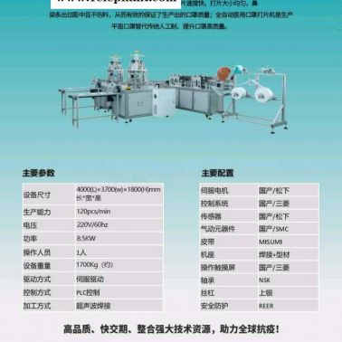 详细信息 口罩本体机 口罩本体机 ,亦称口罩打片机,是用于自动化生产多层材质平面口罩成品之机台,可使用1~4层PP纺粘无纺布 活性炭以及过滤材料,整个机台从原材料入料到鼻线插入,封边,裁切成品均为一条线自动化作业,根据所使用的原材料不同,可以达到如N95,FFP2等不同的标准。该平面口罩生产设备性能稳定,产量高,不良率低,易于操作。口罩本体机外加几台 ink id="_724619" style="-webkit-tap-highlight-color: transparent; margin: 0px; padding: 0px;"> 内耳带口罩机 ink> ink id="_724640" style="-webkit-tap-highlight-color: transparent; margin: 0px; padding: 0px;"> 外耳带口罩机 ink> ink id="_724661" style="-webkit-tap-highlight-color: transparent; margin: 0px; padding: 0px;"> 绑带式口罩机 ink> 耳带点焊机 ,可以生产内耳带口罩、外耳带口罩、绑带口罩等各式口罩。 一次性口罩机为全自动化生产口罩本体,从自动送料、折景、包边、超声波熔合、切片等一条线自动化作业,省工省时,机器的产能达每分钟160~180片。 机器特性:机台实密、休积小、占地小、高稳定性、性能优异、料斗可自动停机,更换模具可生产多种尺寸口罩,铝合金机台结构,经氧化处理坚固不生锈,外形美观,干净达净化要求,自动张力控制,可调试超声波熔接。折景位置可调整,原料卷材可在运行中左右调整对边,可制作一至四层(或多层)的口罩,电脑程式控制,光电检测,可靠性极高,故障率低 内耳带口罩机 内耳带 ink id="_724942" style="-webkit-tap-highlight-color: transparent; margin: 0px; padding: 0px;"> 口罩机 ink> 工作原理: 内耳带 ink id="_724983" style="-webkit-tap-highlight-color: transparent; margin: 0px; padding: 0px;"> 口罩机 ink> ink id="_7241004" style="-webkit-tap-highlight-color: transparent; margin: 0px; padding: 0px;"> 超声波 ink> 焊接方式,当口罩移至加工的位置时,超声波自动产生,在耳带上形成微振幅高频率的振动,并瞬间转化为热量,熔融所要加工的材料, 后使耳带 性的粘贴或埋植在口罩本体内侧,是内耳带口罩生产 后一道加工工序,仅需一名操作员将口罩本体一片片置放于口罩盘内,后续动作至成品完成由设备自动操作。 内耳带口罩机参数: 机台尺寸:1915(L)*855(W)*1780(H)mm 电 压:220V,1or 3 phase 产 能:40-50pcs/min 耗电量:6KW 气 压:6kg/cm2 频 率:20KHZ 内耳带口罩机特点: 1.机台实密,不占空间。 2.全机台使用铝合金,美观坚固不生绣。 3.稳定性高,故障率低。 4.光电检测,降低失误率。 5.此机采机超声波台湾系统,日本换能器,性能稳定,操作方便。 内耳带口罩机工作流程: 工作流程:(口罩本体)人工入料→耳带自动入料→超声波耳带熔接→无纺布边带入料及包边→超声波边带熔接→边带切断→成品输出→计数→成品堆叠→输送带装置送出 绑带式口罩机 绑带式口罩机一般采用超声波焊接方式,于机台上设置输送装置,于输送装置输入口罩半成品,经过拉筒包边,再以超声波花轮压合后,将绑带切断,从而输出成品,只需一人将口罩本体置於机器的传输带上,其余后续工作均全自动完成。 绑带式口罩机技术参数: 电压:220V 频率:20K 两套超声波系统 功率:3kw 产量:25-30片/每分钟 机台尺寸:1900(L) X 730(W) X 1300(H) mm 机台重量:300KG 绑带式口罩机特点: 1.机架采用铝合金及不锈钢,外观轻巧美观不生锈。 2.自动计数,可有效控制生产效率和生产进度。 3.变频控制,可根据实际需要调节设备运行速度。 4.拉筒入料,定位更精准,可使原材料宽度控制到 小,节约成本。 外耳带口罩机 外耳带口罩机口罩机工作原理 外耳带口罩机将松紧带以超音波方式熔合于口罩本体两外侧,进而完成耳带式口罩成品,仅需一名操作员将口罩本体一片片置于输送带治具上,其余后续动作至成品完成皆由机台自动操作,本机产量较一般耳带机高。 外耳带口罩机参数: 机台尺寸:2646(L)*620(W)*1750(H)m/m 电压:单相220V 产量:45-55pcs/min 气压:6kg/cm2 耗电:2.3KW 口罩本体尺寸必须固定 外耳带口罩机特点: 1、机台实密,体积小,不占空间; 2、PLC程式控制,稳定性高,故障率低; 3、全机台采用铝合金结构,美观坚固不生锈; 4、光电检测,降低失误率。 5、耳带熔接强度可调。