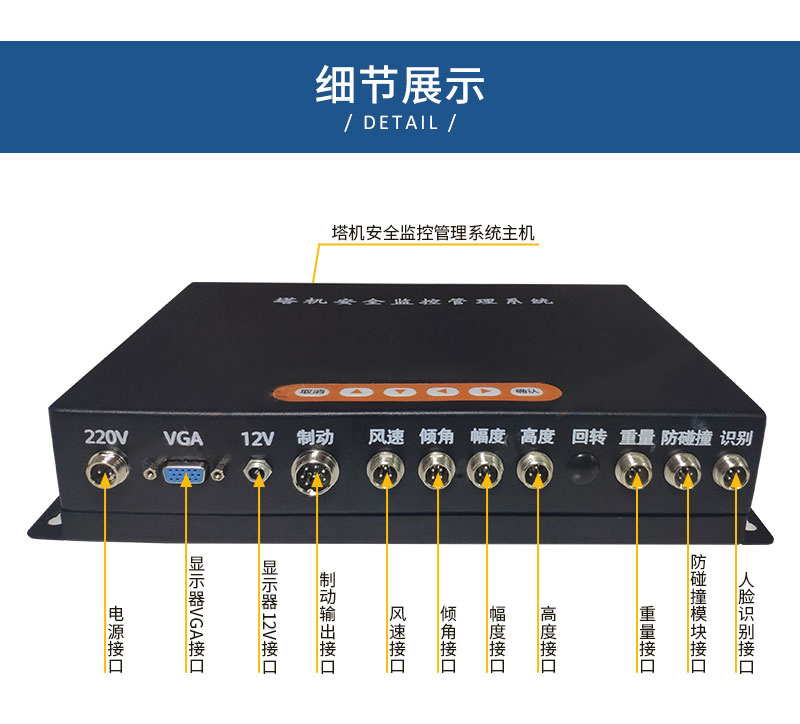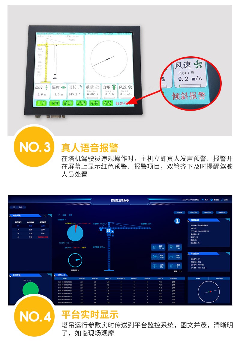 详细信息 ZXTJ8000L塔机安全监控管理系统(俗称:塔机黑匣子)是集互联网技术、传感器技术、嵌入式技术、数据采集储存技术、数据库技术等高科技应用技术为一体的综合性新型仪器。该仪器能实现多方实时监管、区域防碰撞、塔群防碰撞、防倾翻、防超载、实时报警、实时数据无线上传及记录数据黑匣子、精准吊装、塔机远程网上备案登记等功能,特别是该仪器的后台着重加强了监管部门对塔机的管理备案程序,是新形势下,主管部门和各工地业主人性化服务,高效执法的有效手段。