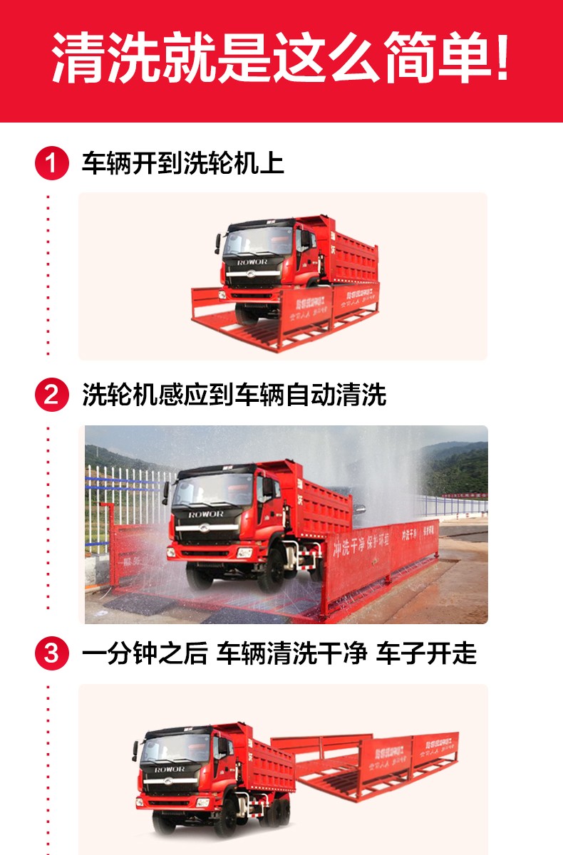 详细信息 质诺优信工地洗车平台适用于各类建筑工地、矿业工场、水泥制品厂、煤矿、发电厂、圾填埋厂等场所的进出车辆清洗。从而达到无粉尘污染的优良工程。该设备安装运输方便,可适用各种工地频繁转场的需要。 优势:1.全自动感应,无需人工操作,节省人力成本。 2.高压清洗彻底,0-60秒即可清洗完毕,水可循环利用,节约用水。 3.平板式结构,牢固耐用,可分块安装拆卸,可重复使用。 4.运输安装拆卸简单快捷,2小时即可安装完投入使用。 5.应用广泛,可适应不同的工地施工场地。