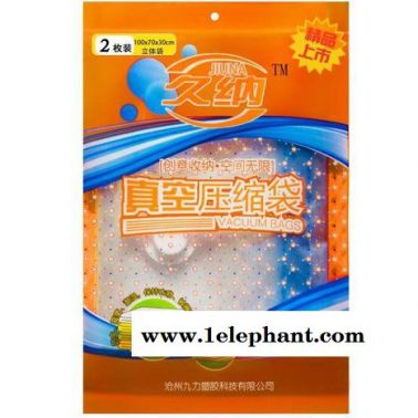 我公司所生产的久纳牌真空压缩袋,主要采用PA+PE材质9丝工艺,厚度适中。产品主要拥有八大优势,1、产品加厚 ,相对于一些其他产品,在厚度上得到了保证,可以加大承受力。2、抗菌 、防虫、防潮,相较于其他容器,真空压缩袋不仅节省了用户的使用空间,因为真空的原因,使衣物等不易受潮、虫蛀。3、超高密封,本产品全面升级气阀,软胶加厚一倍****技术,一体式单项抽气口,内含硅胶软垫,外置防尘压盖一体成型,无缝隙,不漏气,有效阻止空气回流,密封性更强。4、反复使用,寿命长久,本产品采用PA+PE材质,可反复使用,期限更长。5、专业品牌,久纳自成立以来,一直致力于收纳袋的研发与生产,经过不懈努力,已经可以与当下同行所**。