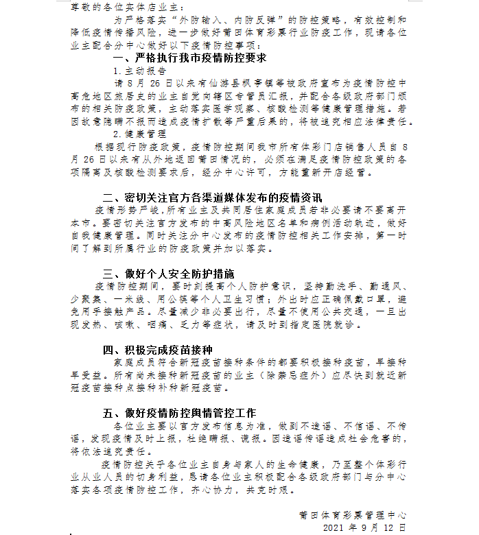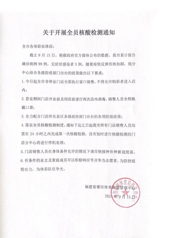 9月10日晚,莆田体彩中心疫情防控工作小组迅速行动,统筹部署,明确分工,压实责任,制定预案,细化措施。一是根据防疫部门要求及实际情况督导实体店按照《福建省体育彩票销售网点疫情防护指南》的要求,做好防护工作,确保销售场所和人员安全。于9月11日两次召开《加强疫情防控部署工作》线上会议,确保中心人员、专管员、销售人员会议精神全覆盖;二是排查涉疫地区接触史的员工,除了填写每日的疫情调查表格外,还及时向监管部门及省中心报送排查情况;三是积极参与第一轮全市核酸检测,9月15日前中心全部人员和所有体彩销售员已全部完成第一轮核酸检测;四是做好舆情管理、突发事件及重大事件报告管理等工作,提示员工做好个人防护,及时在群里转发权威信息,做到不造谣、不传谣、不信谣。