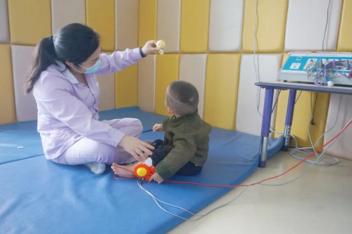爱佑新生儿童养护中心工作人员帮孩子进行康复训练