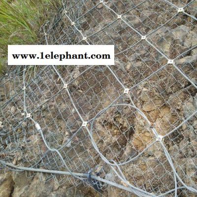 钢丝绳边坡防护网8mm*300*300mm钢丝绳系统是以钢丝绳网为主的各类柔性网夏盖包裹在所需防护斜坡或着石上,以限制坡面岩石土体的风化剥落或破坏以及为岩崩場(加固作用),或将落石控制于- -定范围内运动(围护作用)。